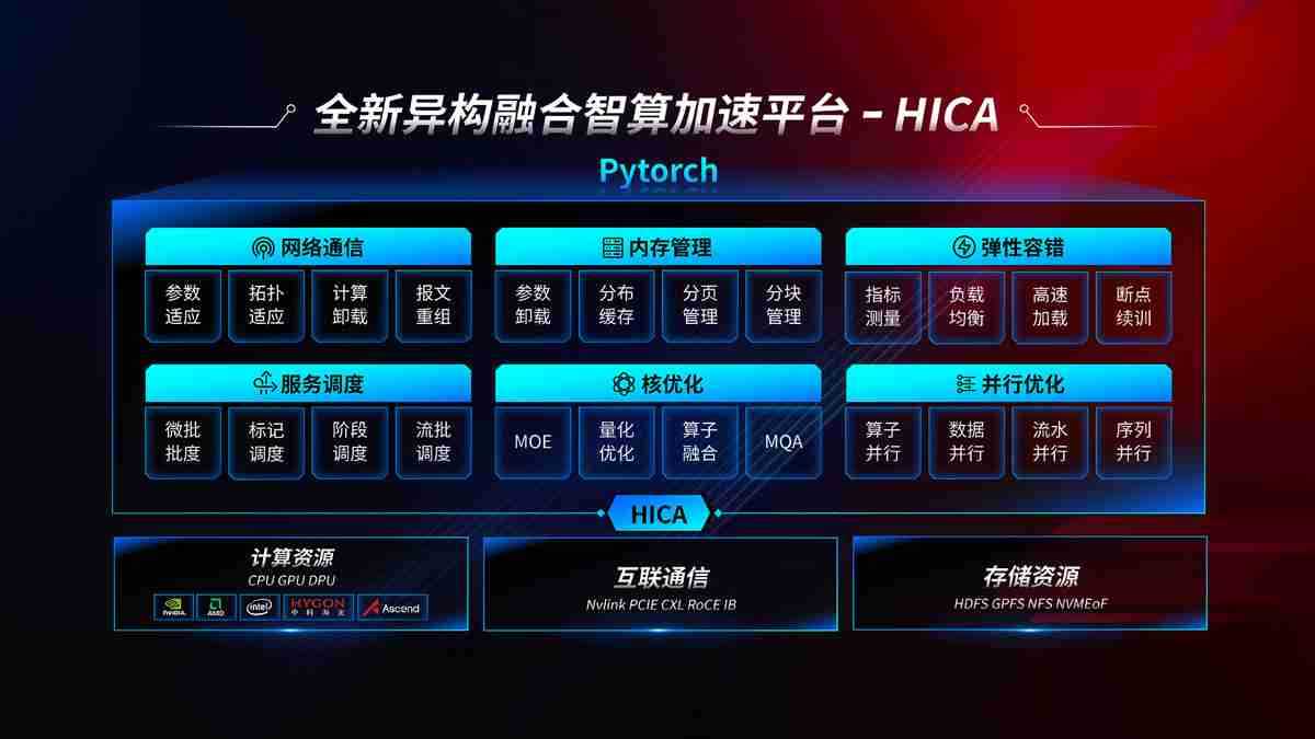 通过自研的服务层、、、、中间适配层、、、以及调度编排算法,,,,采用数据并行、、、、模型并行等多种并行方式,,把并行计算任务进行有效的分解,,,,使其分别由相应的软件栈和算力资源来承接。。。当GPU资源变化,,HICA可以实时动态调度计算子任务并调整模型拓扑和架构,,,以充分聚合各种算力资源。。。。
