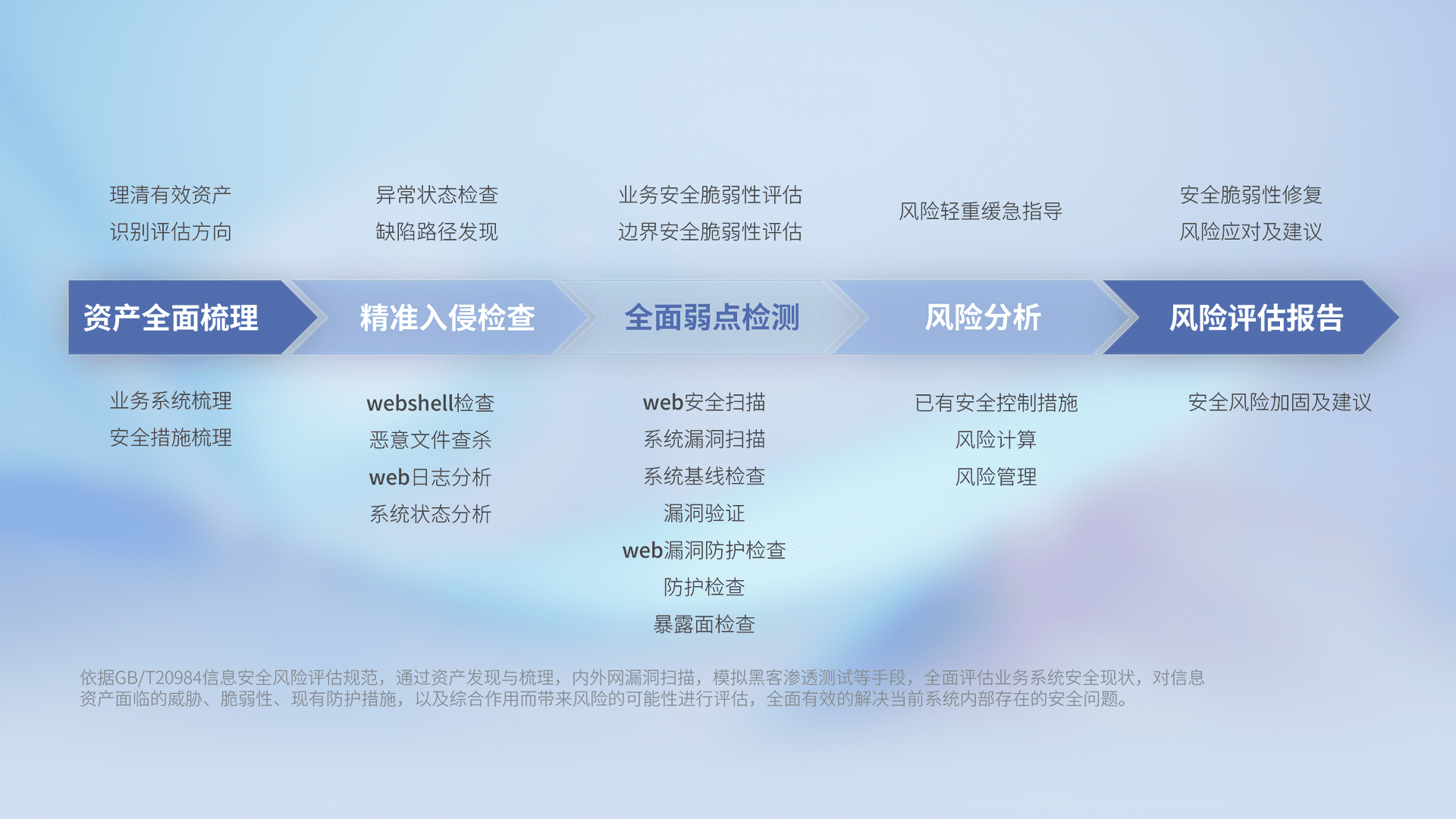 针对客户行业特性,,,以专业的安全服务+多厂商联合解决方案提供专属的一站式安全管理服务,,帮助客户全面感知网络空间威胁,,基于识别、、、、检测、、分析、、防护、、监测、、、响应的服务理论模型,,,,从方案咨询、、、集成交付、、、、评估验证、、、优化加固、、运维运营,,致力于为客户提供完整的闭环管理式安全服务。。。。以实战经验为客户打造高抵御风险的安全体系,,帮助客户发现威胁、、对抗威胁、、、、处置威胁,,不断积累安全对抗能力,,持续保障数字化安全。。。。